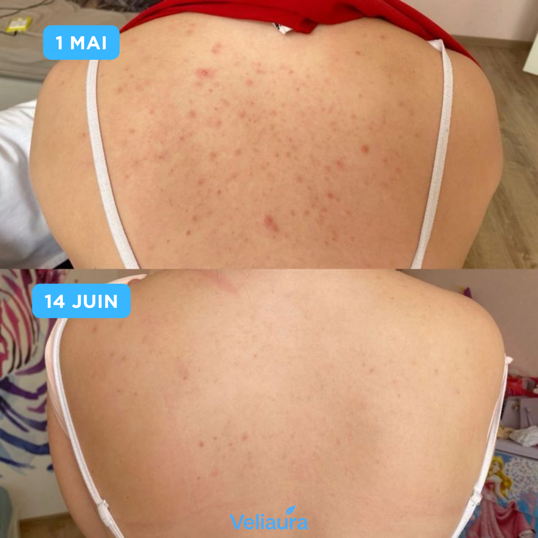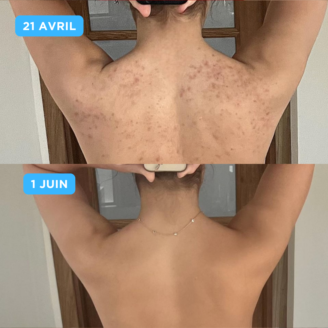 Oui. Notre savon a été conçu spécialement pour l’acné corporelle (dos, épaules, poitrine). Les premiers résultats apparaissent dès 1 à 2 semaines d’utilisation régulière.